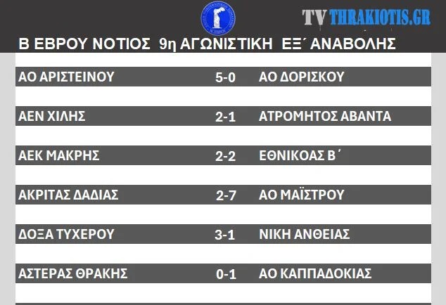 ΑΠΟΤΕΛΕΣΜΑΤΑ ΣΑΒΒΑΤΟΥ 3ης ΑΓΩΝΙΣΤΙΚΗΣ Α ΕΒΡΟΥ ΜΕ ΤΟΝ ΕΘΝΙΚΟ ΝΑ ΣΚΟΝΤΑΦΤΕΙ ΣΤΟ "ΦΩΤΗΣ ΚΟΣΜΑΣ"